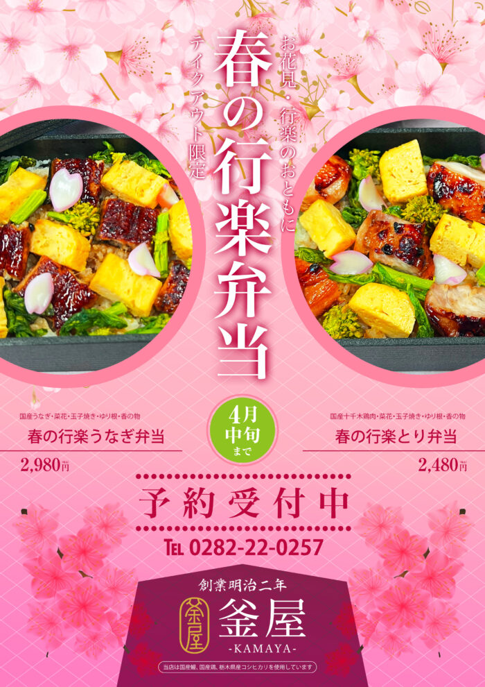 春の行楽うなぎ弁当 いつも当店をご利用いただきまして誠にありがとうございます。 今年も春の行楽弁当をご用意いたします。 ちょっとしたおもてなしや女子会、会社の会食等にご利用いただけますよう、うな重をアレンジいたしました。 期間は春の小物が無くなり次第終了となりますので、まずはご予約お待ちいたしております。